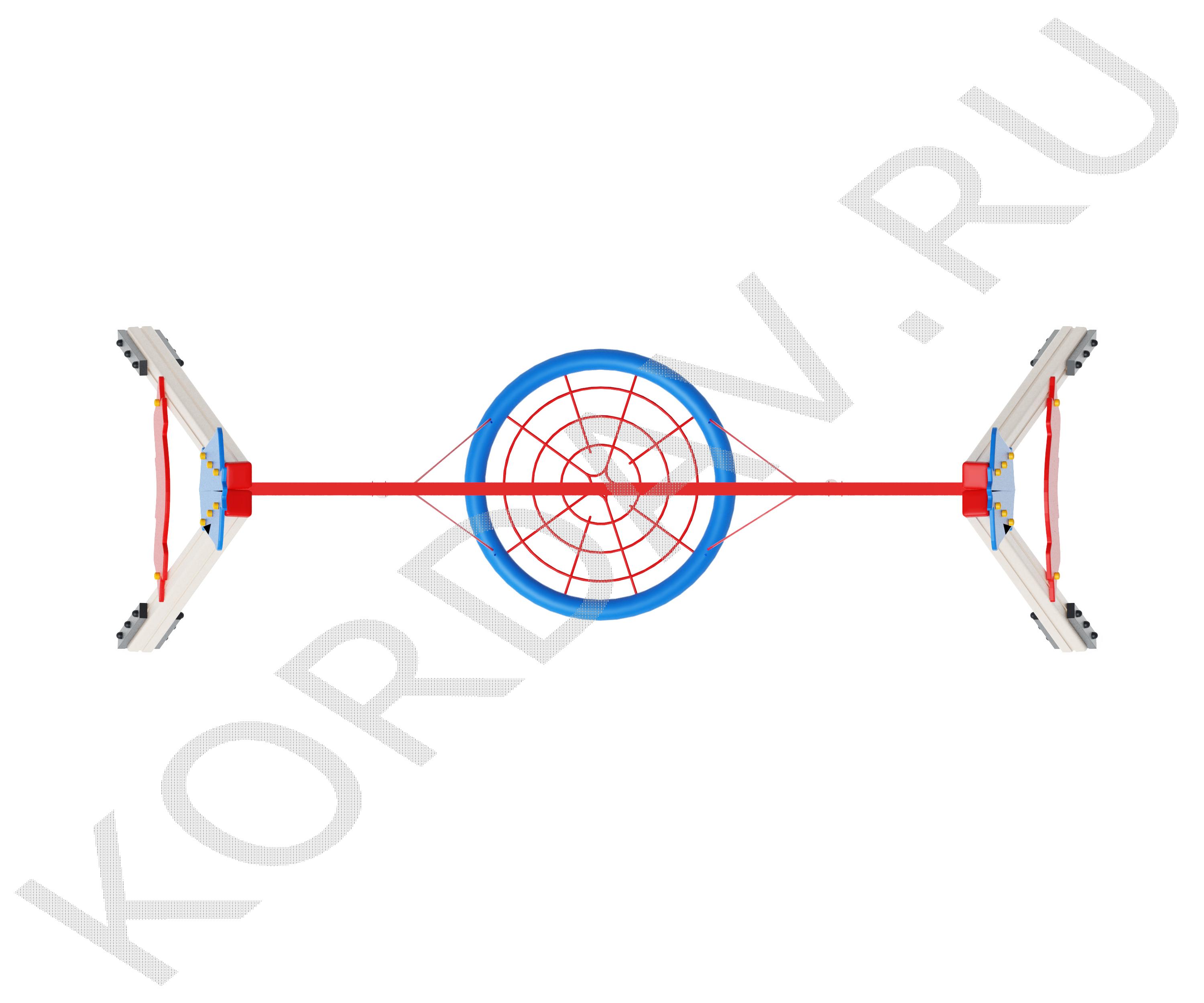 Сиденье «Гнездо»Диаметр сиденья — 1000 мм. Плетение внутри кольца выполнено из четырёхпрядного армированного каната диаметром 16 мм. Качели комплектуются подвесами из шестипрядного армированного каната. Длина подвесов — 1340 мм. Подвес из цепи. Цепь: короткозвеньевая, не калиброванного класса, прочность металла Т(8), диаметр сечения звена цепи 6 мм. Цепи соединены в единый подвес наконечником для крепления к перекладине качели. Наконечник выполнен из втулки с подшипниками и скобы.